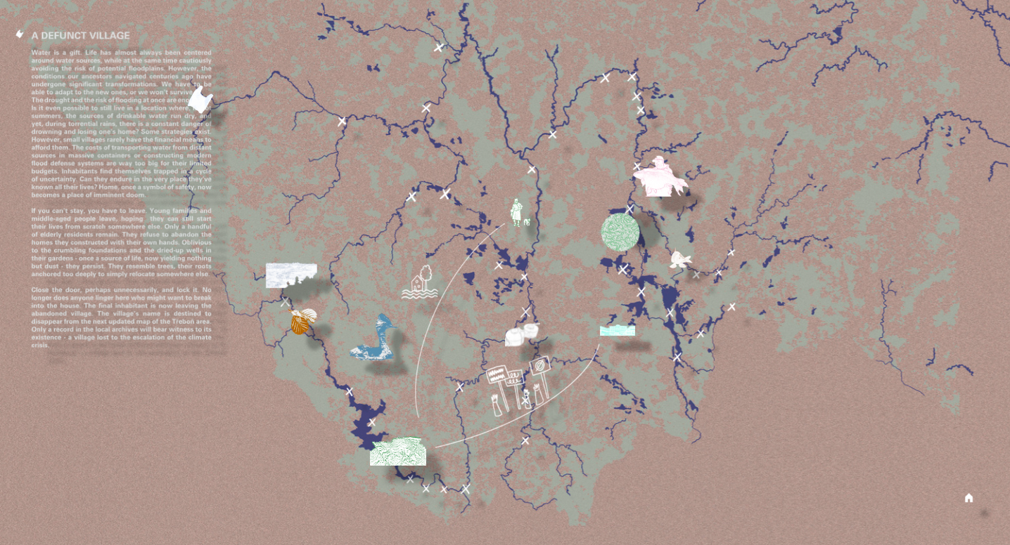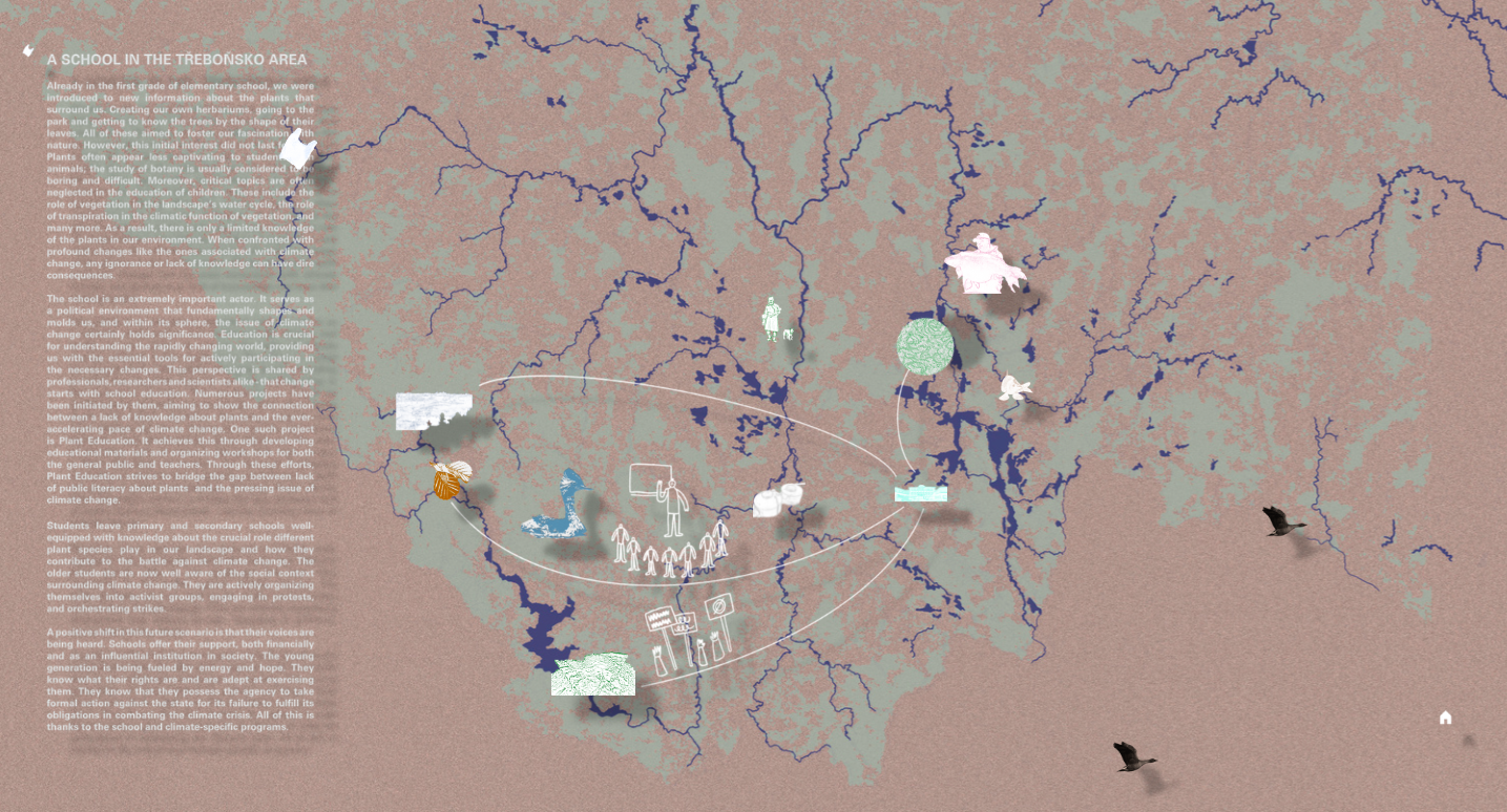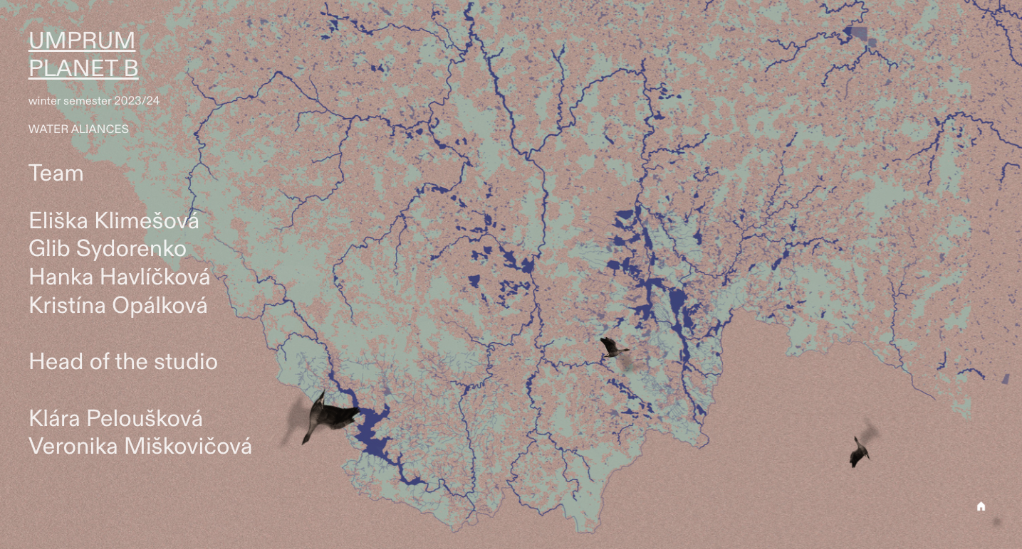 The proposed way of representation defies abstraction as a foundational principle of cartography. The team focused on a specific area: the aquatic ecosystem of South Bohemia, near the town of Třeboň. The stories the “fluid” map tells narrates both the history and the future of various entities that are bound together by the common denominator of climate change and its impacts on the local ecosystems and the global water cycle. The landscape of South Bohemia is interlaced with water bodies, be it rivers, artificial waterways or ponds built in high density over the past five centuries. Eurasian carps, cyanobacteria, black-necked grebes, phosphorus or nitrogen, sewers, alder trees but also long forgotten defunct villages are mutually entangled in a complex web of uneasy, often ambivalent relationships mediated by water. Is climate adaptation possible without actually acknowledging these dependencies and what kind of practices would emerge if we embraced the fluidity of territories we try to map?